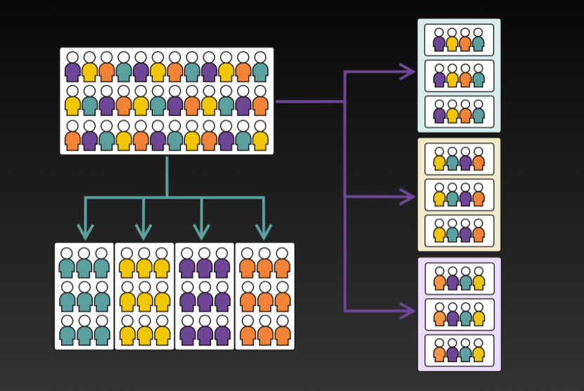 上述图中针对左上角的小人,采用两种不同的分组方式:左下角按颜色分成四组;右侧的图是把相同排序的列为一组,但对应的基础单元,不是一个人,而是四个人。
