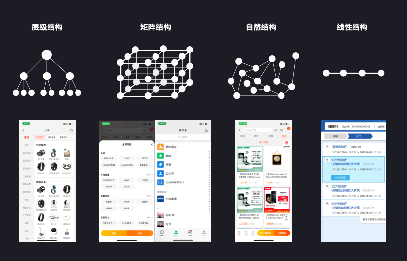 在《用户体验的要素》一书中,将信息的结构分成四种,包括层级结构、矩阵结构、自然结构、线性结构。