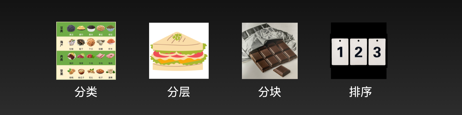 在信息设计中,这里将信息组织的策略整理为:“分类”、“分层”、“分块”和“排序”。
