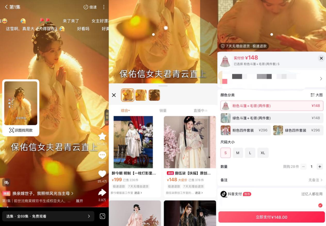 从现阶段的整体表现来看,电商和短剧的结合不外乎以下两种模式:其一是在短剧内容中植入某商品或品牌,令其直接融入剧情成为推进故事发展的道具,让观众潜移默化地接受产品信息,使观众在情感共鸣中产生购买欲望;其二是通过短剧内容所展现的内容,挂载与剧集相关的商品或服务,当剧情围绕某一主题或故事线展开,剧中的角色、场景、情节等都可以成为推荐商品的切入点。