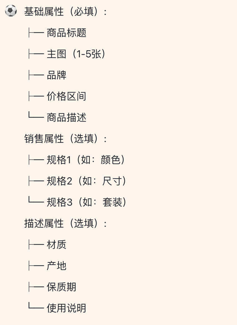特点:根据平台已经沉淀的数据,按照商品的类目、品牌等维度,做标准化的商品模板,例如服装,销售属性预设:尺寸、颜色、材质等,商家直接使用即可。
