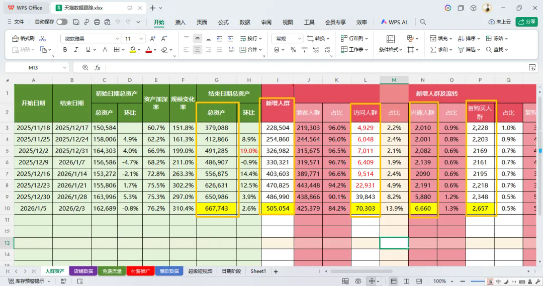 从上图数据可见,人群资产呈现显著增长:人群总资产接近翻倍,兴趣人群增长超3倍,首购人群也提升了约20%。