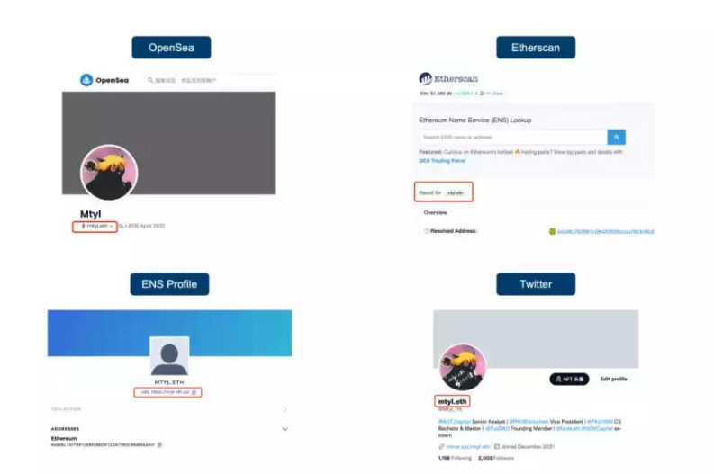 除此之外,除了绑定所在公链的地址之外,域名还有更多的想象空间,因为它也可以与其他公链地址、Web2 账户、甚至 Web2 DNS 地址进行绑定。比如,你只需知道‘mtyl.eth’这个 ENS 域名,就可以直接找到笔者的常用以太坊地址之一、其对应的 Opensea 账号、笔者的 Twitter 账号、笔者在 ENS 的个人主页网站。某种程度上,这是已经显现出了一个 Web3 通用身份的雏形。