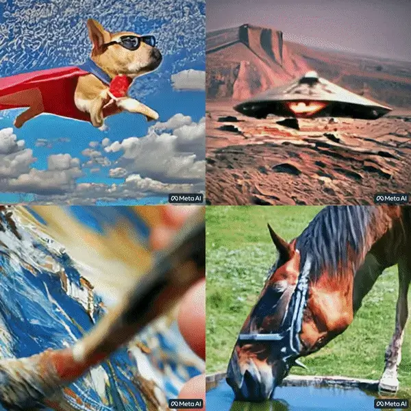 先从Meta家的Make-A-Video看起。在小扎公布的视频中,我们可以看到一场AI制作的视频秀,其中一幕是泰迪熊正在画自画像。仅仅通过文本描述,Make-A-Video就可以生成一段视频。官网的案例中,我们会发现还有一些会飞的超人狗狗、喝水的马等,这些视频都是由AI生成的。