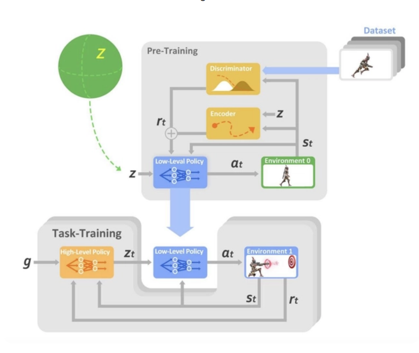 low-level policy可以为各种通用动作建模,根据Environment0定义的玩家习惯状态集可以实现挥剑、走路、冲刺、弯腰、射击等通用动作的训练。在目标训练期间: High-level policy w(z|s,g)被定义为以动作空间数据集s里面用为动作组合z作为变量实现目标g的一个映射,其中z=array(a)。通过High-level policy,已经学会Low-level policy的AI Being可以被指示执行各种特定任务,这些特定任务由Low-level policy里面的一组动作拼接连成。