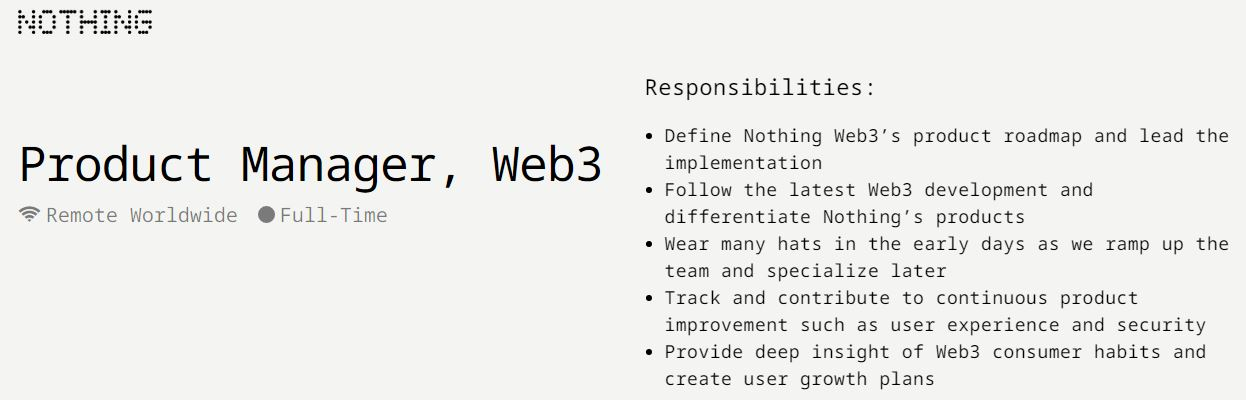 但在 Web3 中情况有所不同。这是来自技术初创公司 Nothing的实际Web3 产品经理职位列表的屏幕截图。你可以看到“在早期承担很多角色……” 被明确列为产品经理的众多职责之一。