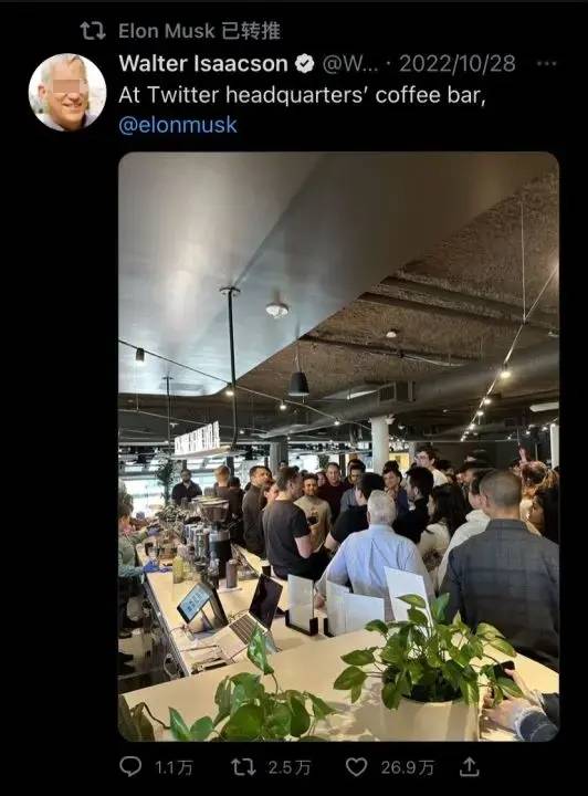这一天是2022年10月26日。两天后,马斯克完成对推特的收购,后者从纳斯达克退市,成为一家私企。他用自己推特转发了一张和员工在Twitter总部咖啡厅交谈的照片,照片上,马斯克身穿黑色短袖T恤,随意地坐在吧台上,员工们则一层层地围在他身边。有满头白发的老人,也有看起来毕业没多久的年轻人,大家脸上都带着笑容,看起来氛围轻松而融洽。