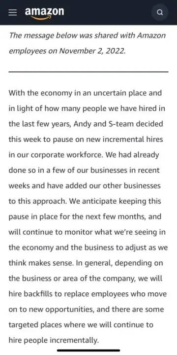 苹果在11月2日被爆出冻结招聘,冻结时间将从当前延续到2023年9月。亚马逊也在10月份相继暂停云业务、零售与物流业务的招聘后,于11月初宣布暂停全公司的招聘。人力资源高级副总裁贝丝·加莱蒂称,亚马逊将在未来几个月中保持暂停招聘状态。