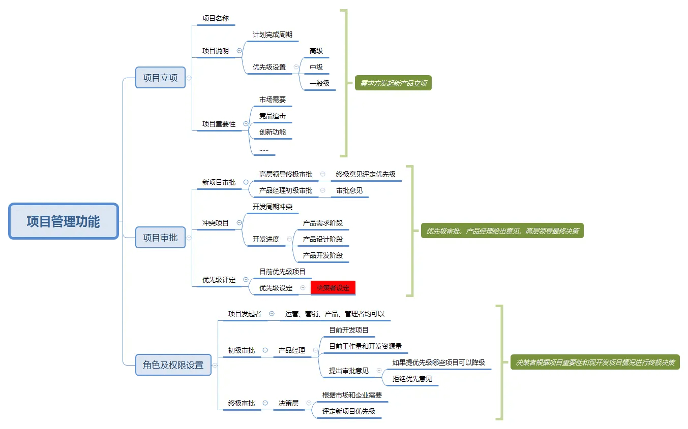 项目优先级设置,新项目优先级提升高层领导决策功能设计。产品经理最头疼的就是多头需求,多个项目开发的优先级问题,虽然产品经理作为项目管理方,但是其受限于职位等因素往往造成优先级不清,还要承受极大地压力和工作强度,与其这样不如将优先级决策权限交给高层领导,由高层领导进行决策,这样产品需求方就很难争抢有限的开发资源,产品设计开发工作也能更顺畅,降低产品经理工作强度和工作压力。