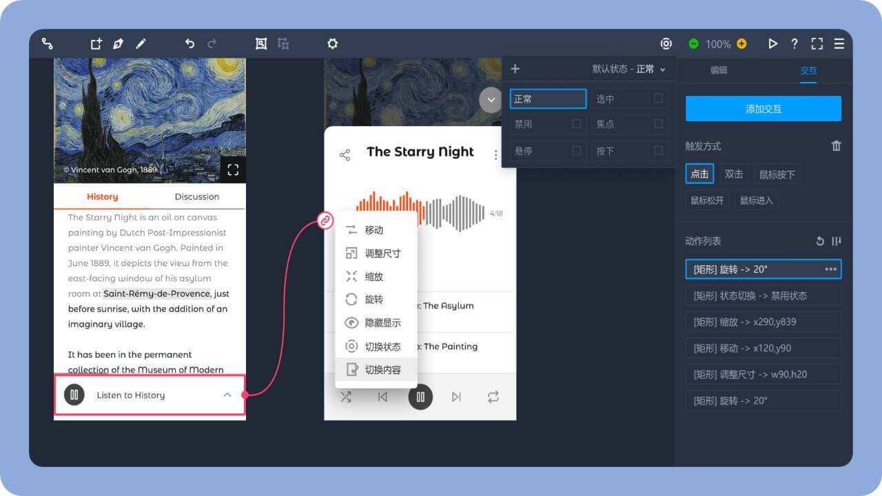 高保真原型需要在低保真的基础上进行配色,插入真实的图片及icon图标。充分利用Axure每一类组件的样式及专有的交互属性为原型增加保真度,为相关的组件及页面添加交互事件、配置交互动作。这样从视觉显示及交互设计来看,就是一个完全高仿的Demo原型。