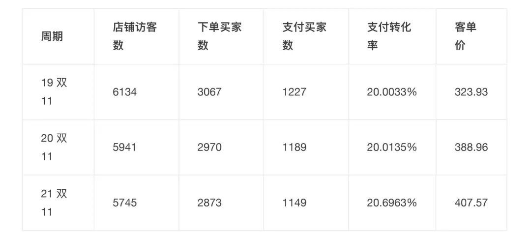 近 3 年(即 19-21 年双 11 期间)的店铺访客数、下单买家数、支付买家数、支付转化率、客单价。