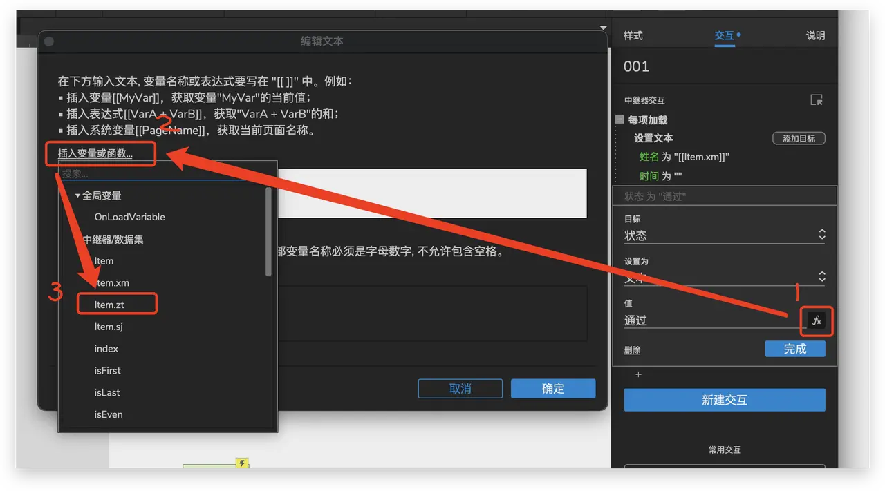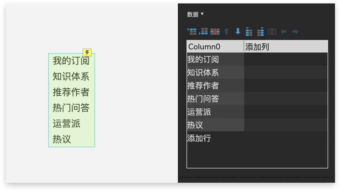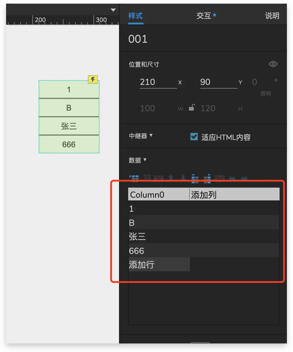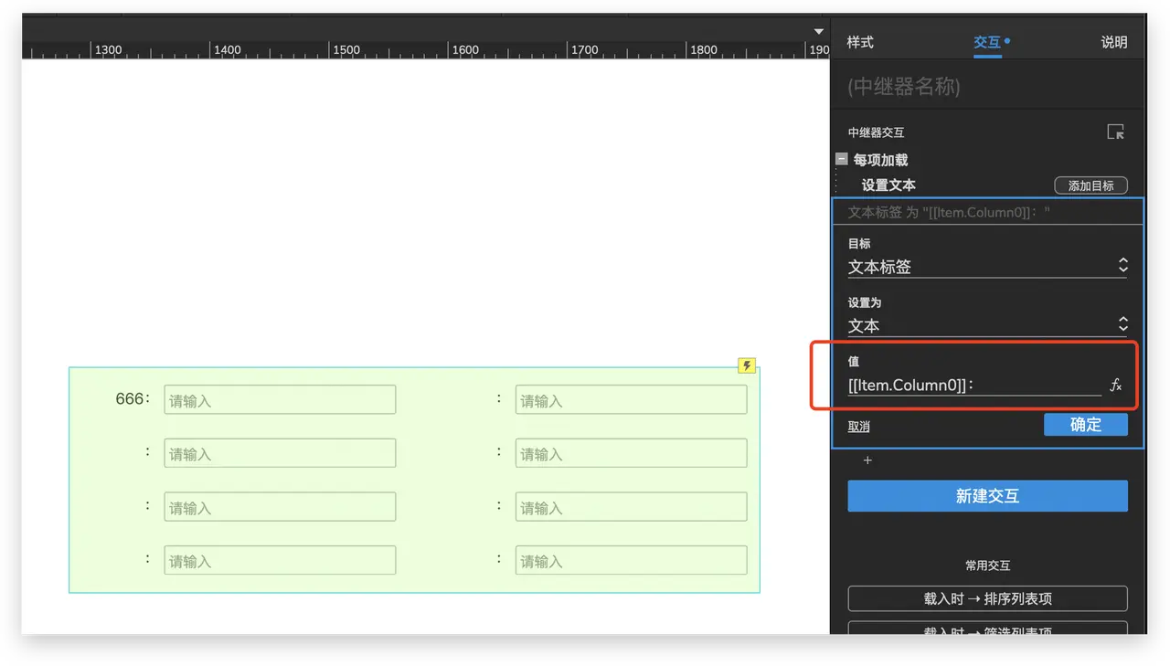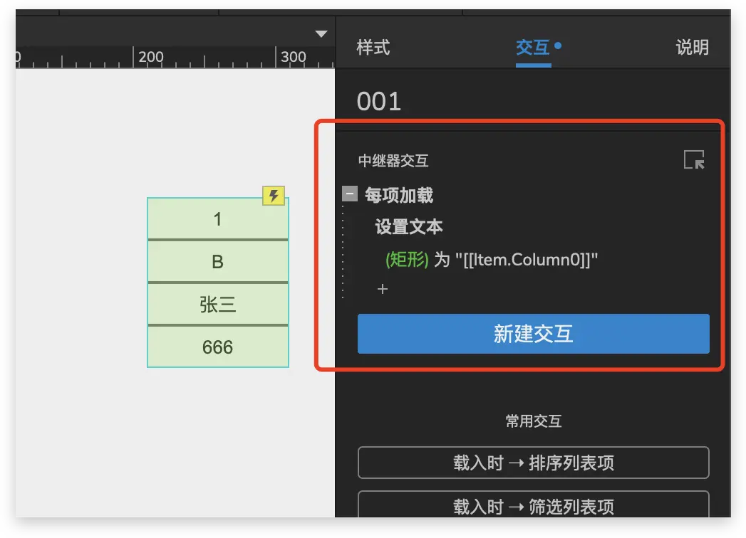 中继器自带一个交互属性,意思是『中继器中的(矩形)文本对应数据列表中的【Column0 】这一列的数据』。