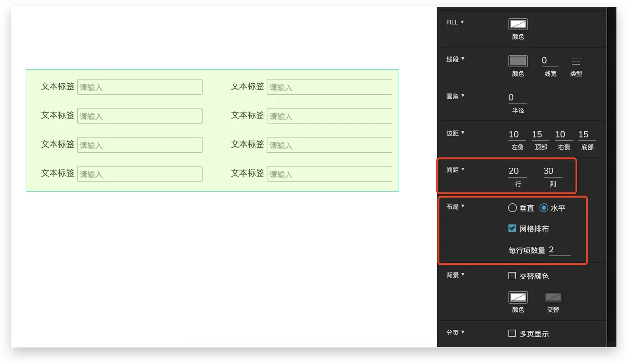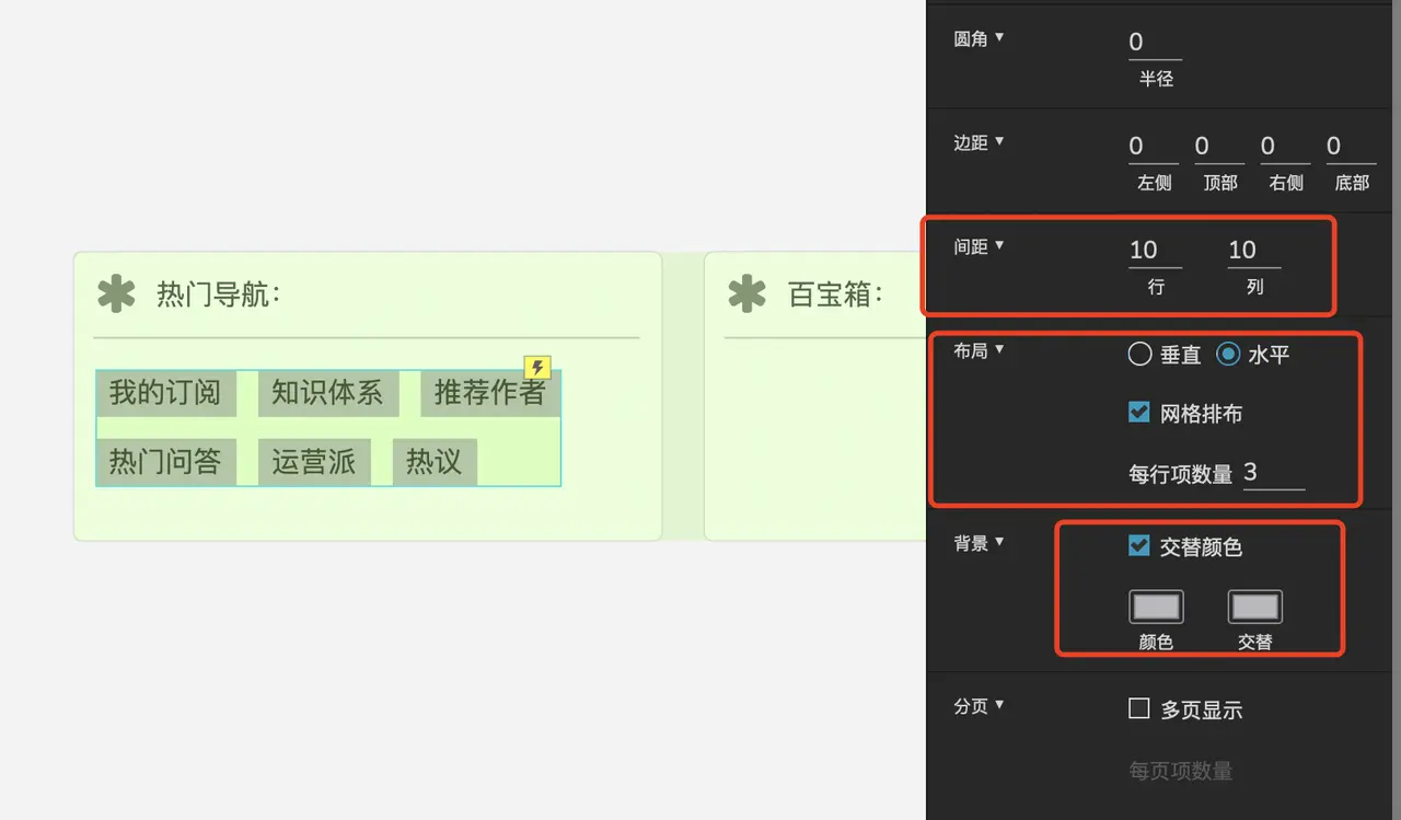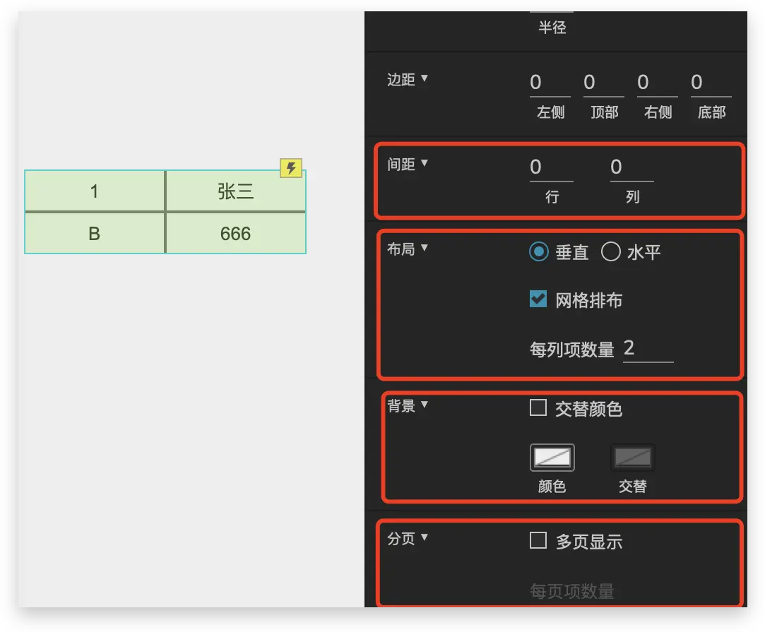 样式页面往下,时中继器独有的属性面板,间距、布局、背景、分页。
