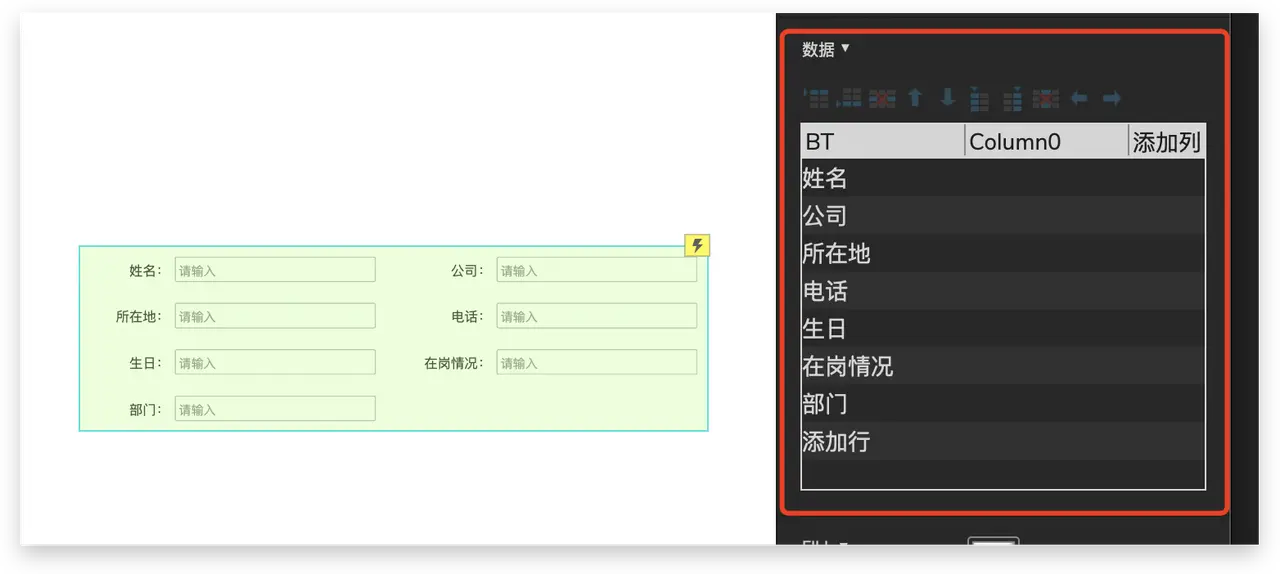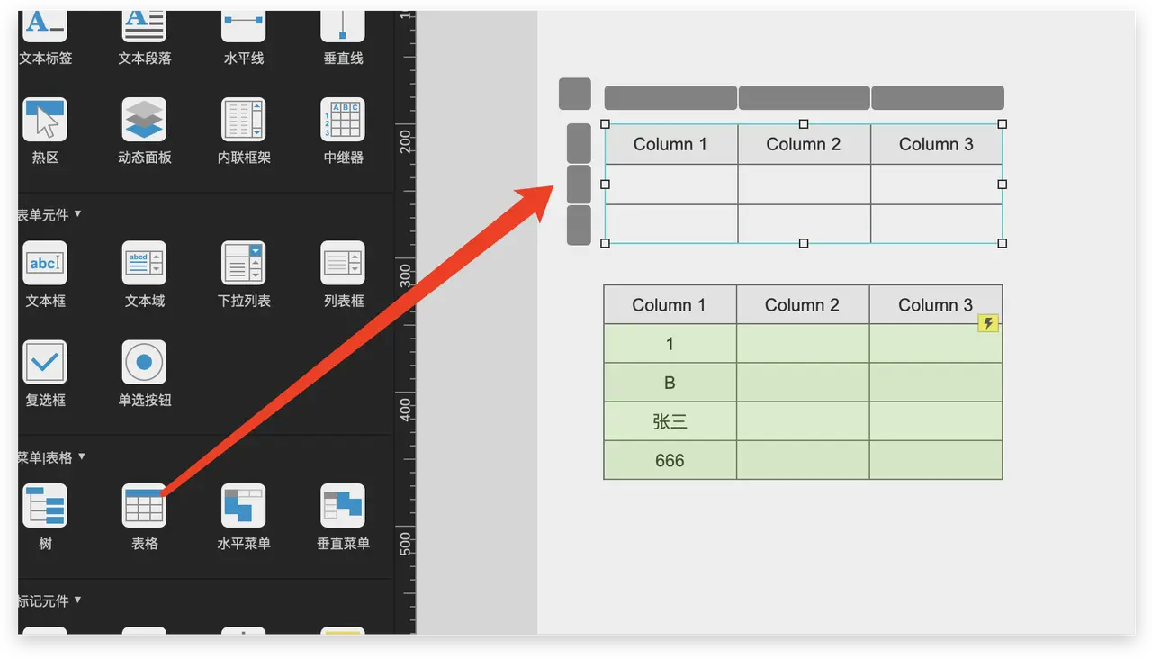 跟其他原件一样,拖拽到面板中使用,面板会默认展示一个三行的表格。