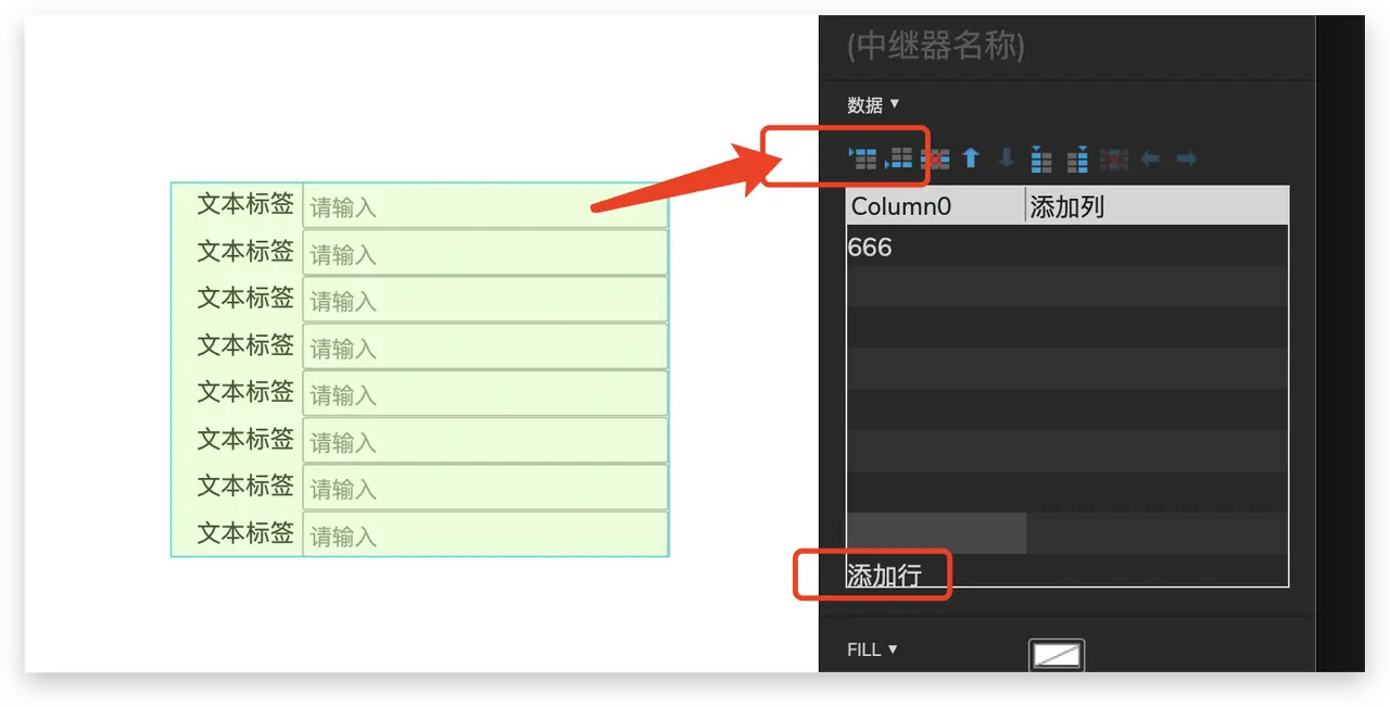 添加数据,对应表格中需要填写的数据,在中继器数据里添加列。