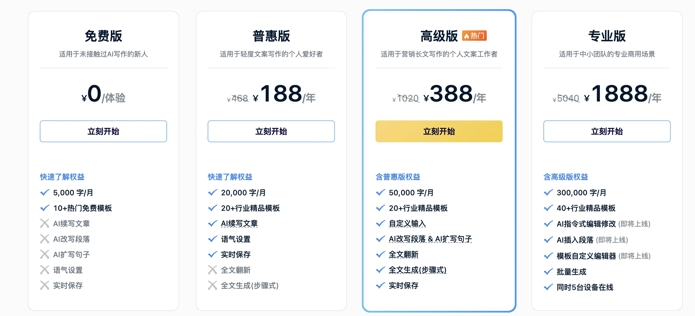 相比而言,国内的某AI产品,驻扎于垂直的写作领域,通过提供SaaS化能力的方式反而更明确的推动了产品商业化的进程,其价格也相对合理,不论是个人版还是面向企业,价格与其他办公类、协同类工具无异,相信其商业化的道路会走的更顺畅些。