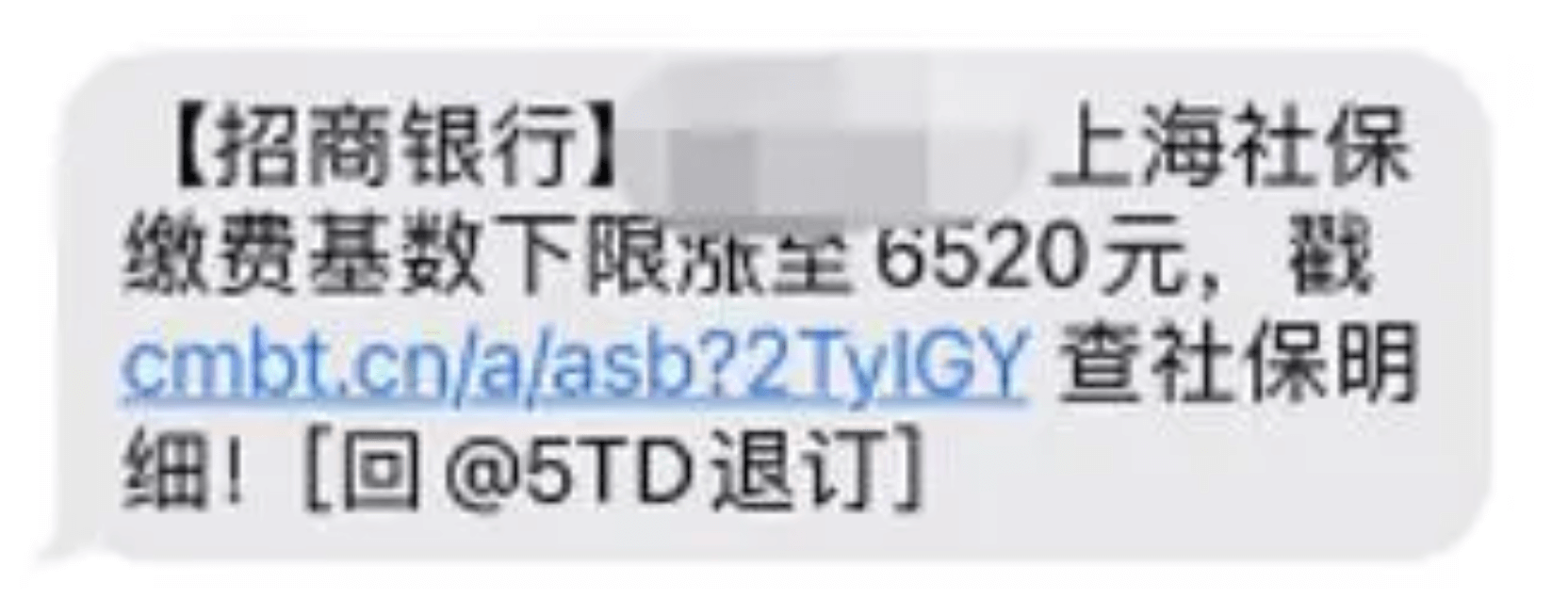如招商银行的这条短信,就为用户点击链接进入客户端创造了一个查找社保缴费基数的使用场景,这也是笔者近期唯一点开的短信链接。