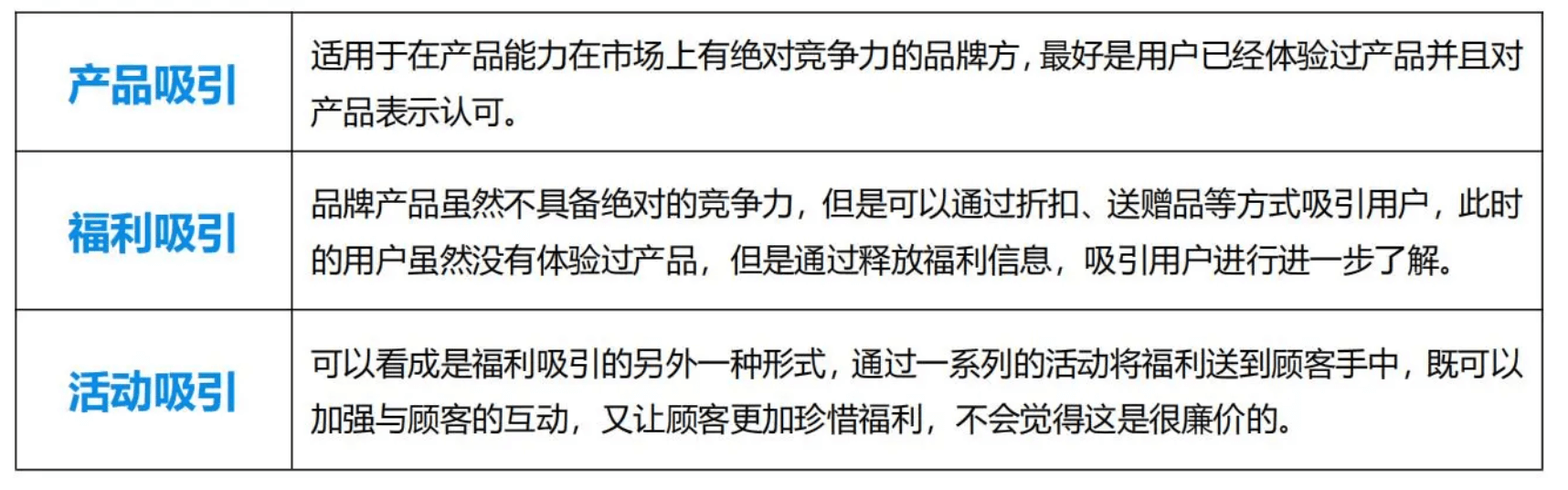 目前品牌在产生吸引上主要有三个方面:产品吸引、福利吸引以及活动吸引。