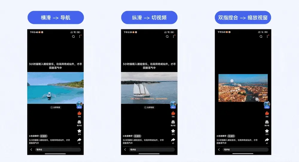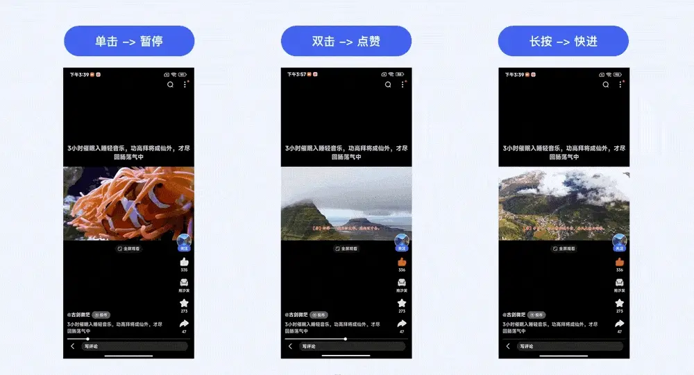 视频场景中目前已有部分的常规单向手势已被用户广泛接受并形成习惯认知,如「单击 →暂停」、「双击→点赞」、「长按→快进」、「横滑→导航」、「纵滑→切视频」、「双指捏合→缩放视窗」等通用手势。