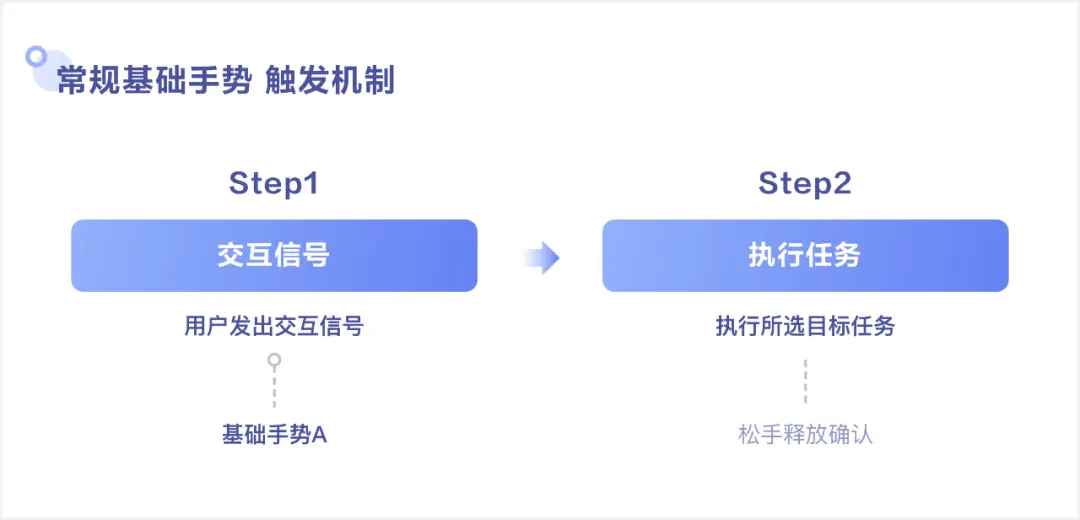 以前述的视频场景常规手势为例,其触发机制一般可分为两个阶段:step1交互信号→step2执行任务,即用户通过某一基础手势发出交互信号,系统收到信号确认后便可立即执行任务,但整个过程是线性的,手势扩展性十分有限且难以满足视频场景对于手势扩容的诉求。
