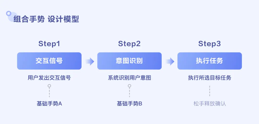 「组合手势」触发一般可分为三个阶段:step1交互信号→step2意图识别→step3执行任务,前两阶段均可由对应的基础分支手势构成并进行组合搭配、以寻求最高效的手势组合触发路径。