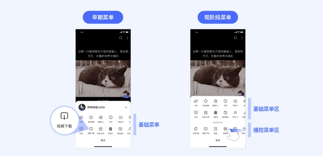 百度APP视频场景早期的播控功能较少,如“视频下载”等个别特色功能入口一般都融合于基础菜单之中。