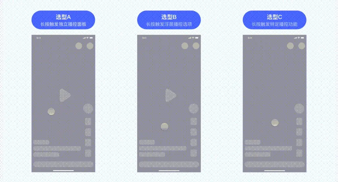 通过对竞品进行调研,我们发现竞品均有使用长按手势作为切入口以触发相关播控功能、并归纳出“视频播控触发”目前主流的三种长按交互选型, 分别为:长按触发独立播控面板、长按触发浮层播控选项、长按触发特定播控功能。