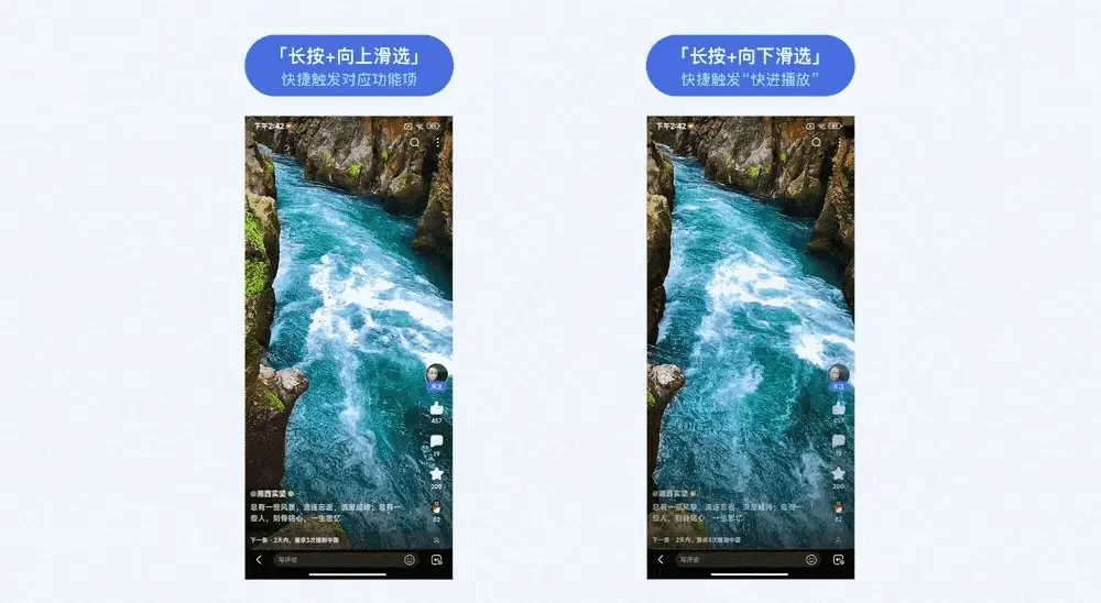 但随之而来的难点是我们目前播放器中的长按手势已被“快进”功能占据,用户对此功能的使用频率高、并已形成较深的操控认知,若直接下线“快进”功能则会对用户使用习惯产生较大影响,尤其是视频场景的重度用户。