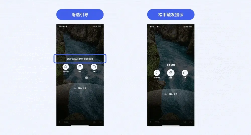 灵活判断当前手势触控状态(如滑入选择 / 松手触发),在界面中即时给出相对应的引导提示或振感反馈,以帮助用户快速适应新的手势触发机制。