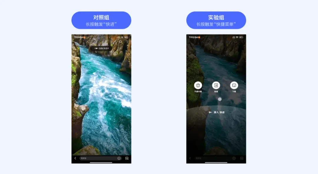 「实验组」的“快进”虽多了一步触发步长,实验前期“快进”使用率不及「对照组」,但随着用户对于「长按+滑选」手势整体的使用占比持续走高,通过滑选触发“快进”的操作习惯也快速被培养起来,对于用户来说,长按快捷菜单带来的整体收益是大于折损的。