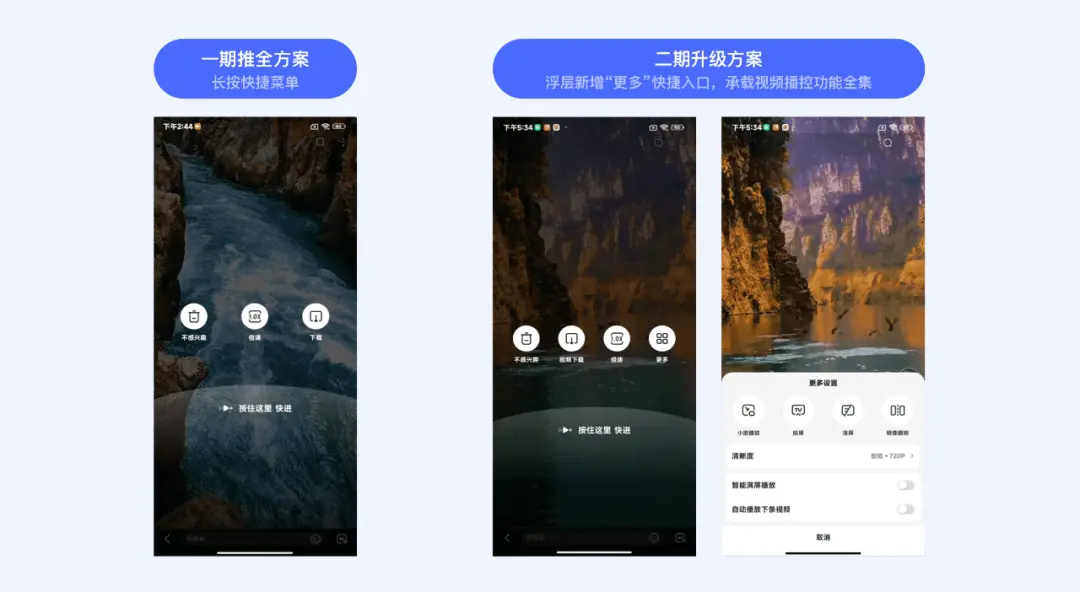 随着长按快捷菜单的上线推全,长按手势的渗透率也持续走高,用户逐渐对视频场景更多的播控功能有了长按触发的诉求,于是我们对长按菜单进行了二期的设计升级,在长按浮层最右侧新增“更多”快捷入口以承接视频场景所有的播控功能,用户通过长按后的可选播控项增多,播控功能整体的使用量得到进一步提升。