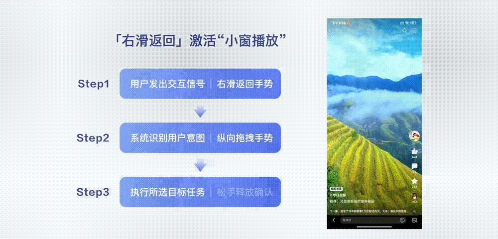 基于用户的此种操控意图,我们以“右滑返回手势”发出交互信号而触发浮出小窗入口,随后系统根据用户“纵向拖拽手势”的行为来判断其是否有激活小窗的意图,若有短距上滑拖拽行为,松手释放即可快捷激活视频小窗,以提升观看体验的连续性。
