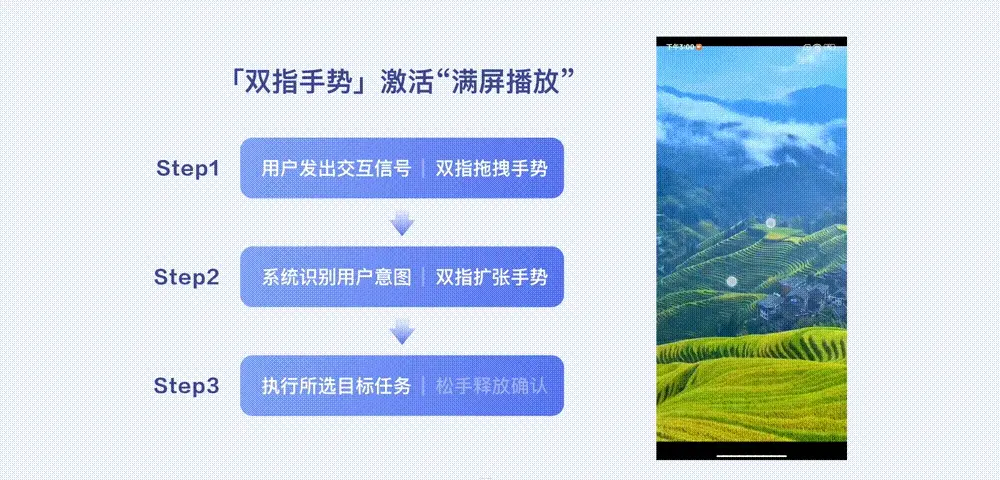 “双指拖拽手势”可拖拽并清屏视窗画面,以此手势发出交互信号,若在“双指拖拽手势”基础上有识别到“双指扩张手势”行为,则松手释放即可快捷激活“满屏播放”,以满足更沉浸视频浏览体验。