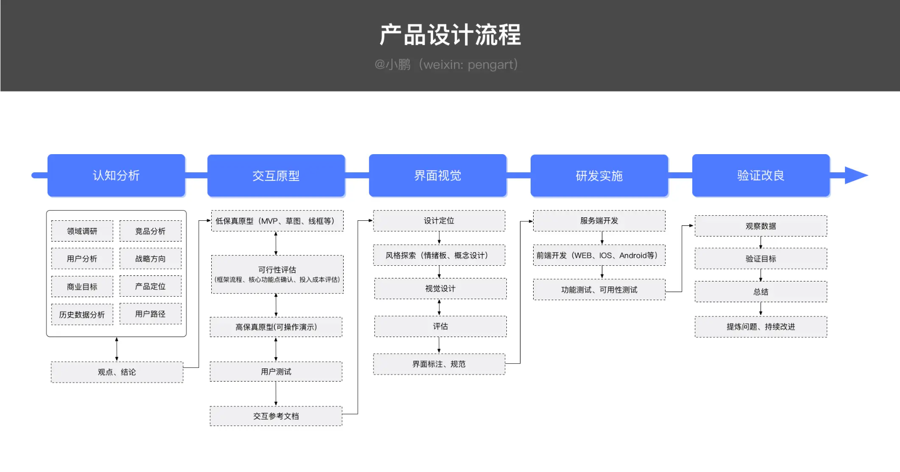 结合自己UI设计、前端开发、产品经理三个维度的实践经验,尝试将产品设计流程大致分为五个阶段: