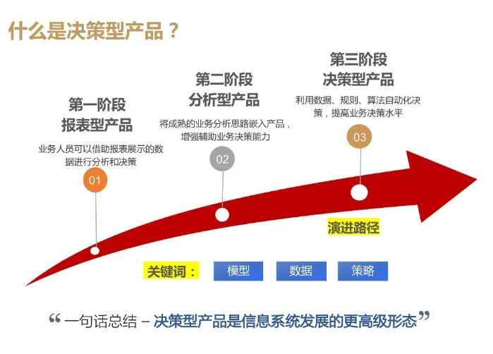 第三阶段,决策型产品,利用数据、规则、算法进行自动化决策,极大提高业务的自动化程度和决策水平;