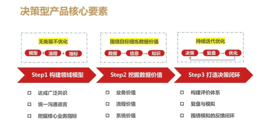 我们认为,决策型产品的核心要素有三个:模型+数据+策略。与此相对应的,为了能够让一个决策型产品成功落地,主要需要做好三件事: