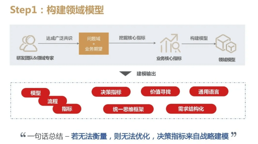 决策型产品设计之初,就应该要求参与产品的各方,都能够对于业务模型、业务流程和业务指标达成共识。该实践的重点是,构建业务模型的工作不能仅仅是由产品技术人员来完成,而是应该由整个团队(包含业务人员、产品、技术、数据等角色)共同完成,让每个角色都能够对业务模型所包含的模块,模块之间的关系等有深刻的、一致的认知。在领域驱动设计(DDD)的实践中提出了一种称为“事件风暴”的方法:业务专家向团队所有成员描述详细的业务流程,整个团队积极参与讨论,并在过程中找到核心域、非核心域,明确实体、聚合、事件等关键元素,最终完成业务模型构建。在具体的实践中,能否高质量地进行事件风暴,除了很考验每一位参与者的专注度与执行力之外,还特别需要一名业务专家的积极投入。因此必须要让业务专家意识到,一方面他的专业知识对于业务模型的构建至关重要,另一方面一套清晰、精准、强大的业务模型也能大大帮助他完成业务目标。即在这个过程中,要让业务专家由提需求的人,变成协助/甚至主导构建业务模型的人。除了对业务模型的构建达成共识外,还需要各方对于整个业务未来的发展取得基本共识,例如未来业务会重点朝哪个方向努力,哪个业务域的可挖掘价值最高等等。这么做的目的是能够让产品技术团队进行一定的提前布局:例如是否需要拆分微服务、是否可以将非核心的模块外包、是否应该在某个模块开发时投入主要精力等。