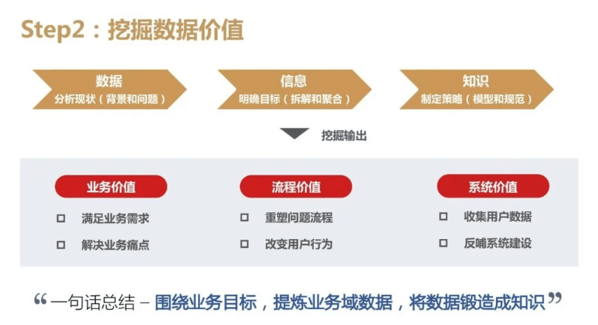 对于互联网这样的数字化业务,业务流程中的方方面面都需要利用数据。一个经得起市场检验的决策,是基于尽可能广泛的数据收集和尽可能严谨的逻辑分析基础上得来的。因此,决策型产品的第二个关键要素是对业务数据的分层抽象与使用,深度挖掘数据价值。我们可以将数据的加工与使用分为三层: