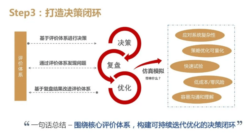 为了能够让决策型产品做出的决策质量更高,必须持续对每一次决策进行复盘,而复盘的关键,就是要看每一次决策对于评价体系的各项指标产生什么影响。更进一步,能够分析出指标变化的原因,从而在下一次的决策过程中调整参数,以期望得到更好的决策结果。上面所说的这个“决策→复盘→优化→再决策”的过程,在实际执行的过程中会比较复杂,主要原因是: