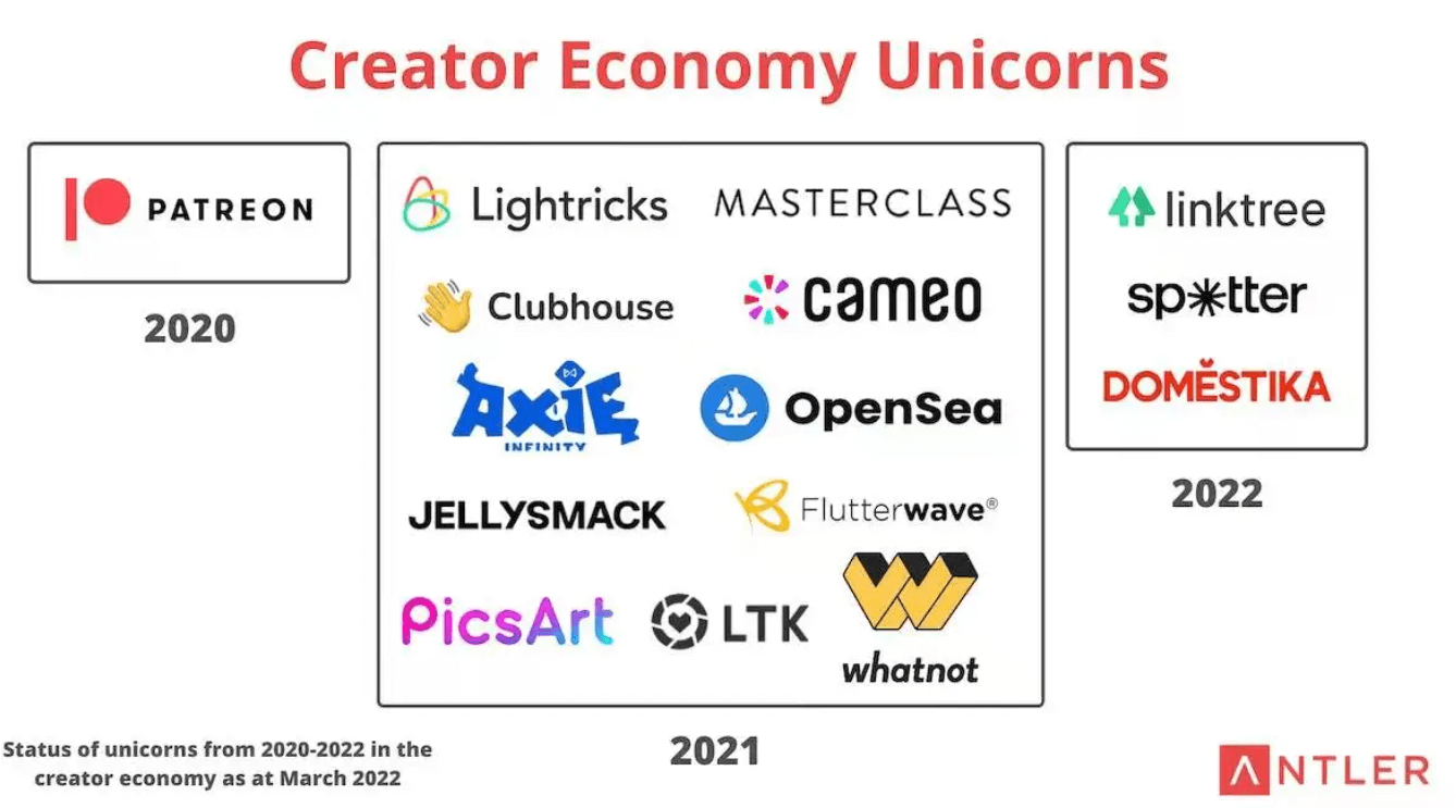 国外也不乏创作者经济领域的独角兽,在2021年,就有11家公司跻身于“独角兽俱乐部”,2022年也有三家新创作者公司成为独角兽。