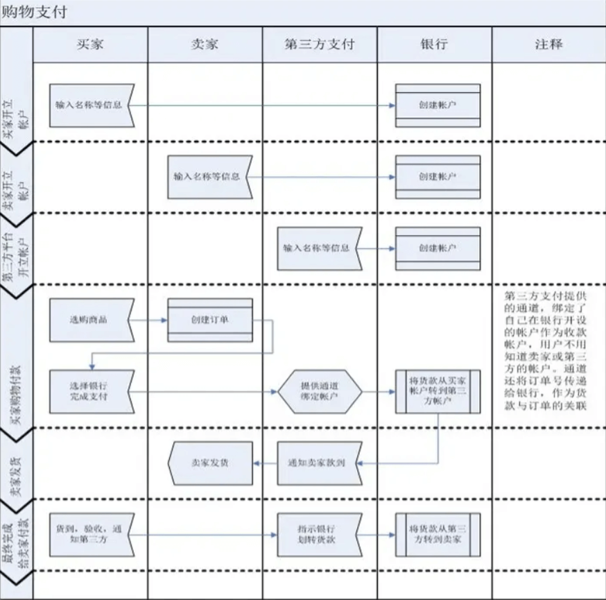 这是网上关于购物支付的泳道图,用来反映业务流程。上述的泳道图涉及到卖家、买家、第三方支付、银行等主体;每个主体都有其相应的任务;并用箭头来表示各个任务之间的先后次序。