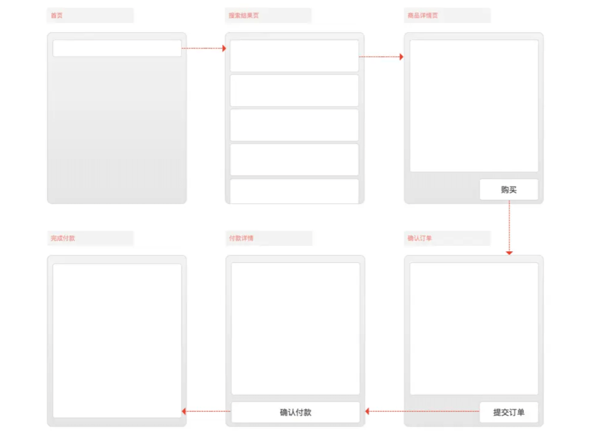 而页面流程图的对象是页面,页面是互联网产品设计最基本的单元,不管APP也好、H5也好、PC端也好,这些产品由一个个页面组成。页面流描述了用户完成一个任务需要经过哪些页面。也就是我在哪,经过什么操作,能去哪。页面流有三个要素:页面、行动点、连接线。下面拿购物的页面流举例说明: