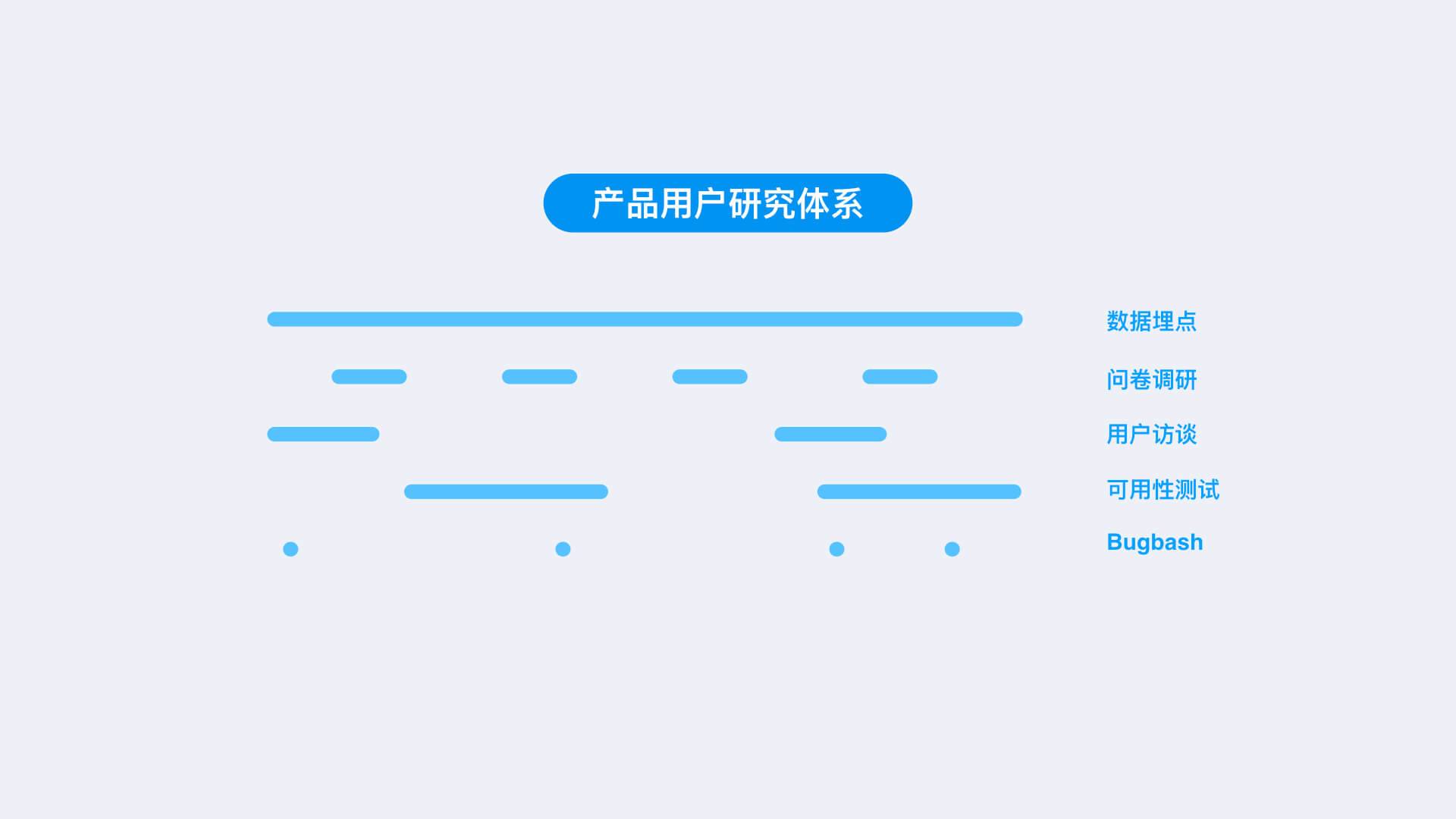 在产品研发流程中接触用户最多的环节集中在用户研究与测试上,通常适用的场景包括了:新的产品领域、复杂流程功能、重大升级改版、设计方案有争议等。用户测试的类型和手法多样,从覆盖面和周期来看特性各不相同。如果将覆盖面较广的数据埋点与季度性的用户访谈与可用性测试、大版本的 bugbash 结合起来,可以为产品构建一个比较完善的用户研究体系。