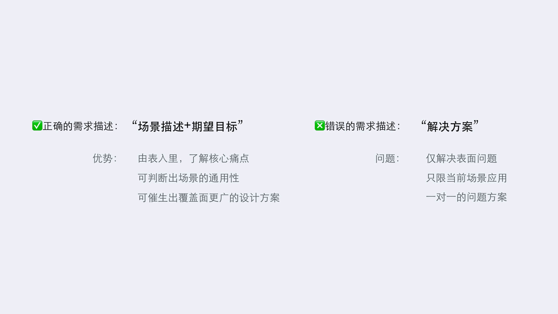 让用户参与到产品的发展计划中有个很容易犯的错误:用户会直接告诉你需要的功能或者提出一个解决方案。这不但不会帮助我们从根本上做出创新,还会阻挡发现用户真正想要的是什么。例如,笔者参与研发的平台用户曾基于已有的发布模式提出了便捷创建关联信息功能,但实际上深层原因源于当前的发布模式已不适应于团队当下状态,平台需要去探索新的发布模式来进行优化和匹配。因此在收集用户需求反馈时,正确的描述应该需要包含的因素有:场景描述+期望目标,如此可以由表入里了解用户核心诉求,衍生出更多样、覆盖面更广的设计方案。