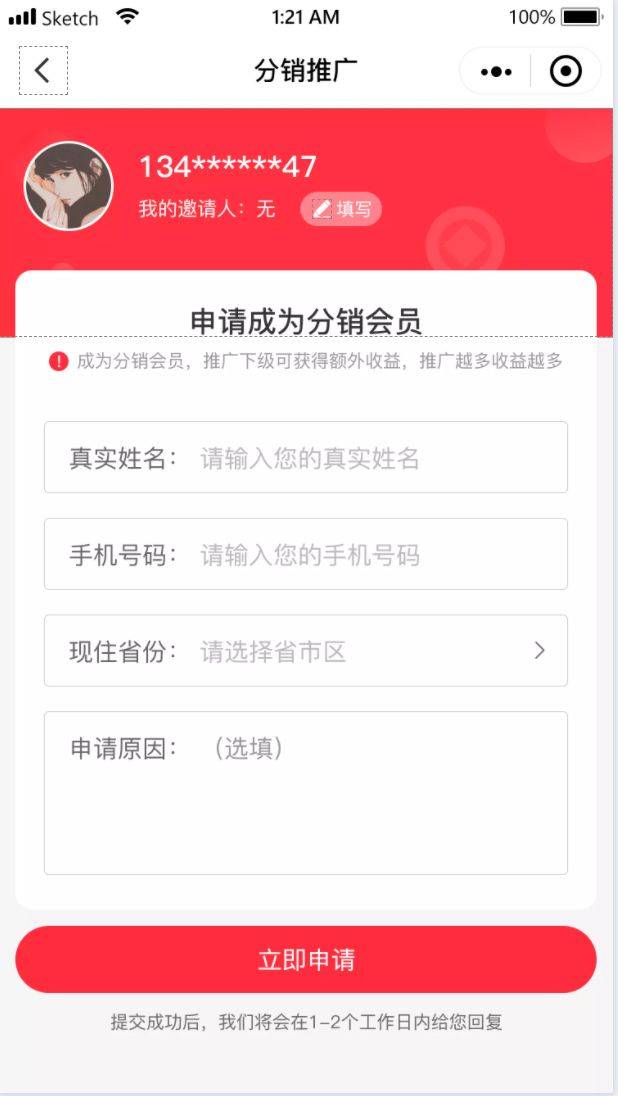 分销商申请模式有“申请分销”、“全员分销”、“后台指定”,基本设置完成后。在商城首页等流量可观的位置(例如:banner位)投放分销广告,C端用户看到分销商招商简介后可以主动申请成为分销商。还可以配合运营在跟多的渠道投放分销广告,吸引分销商。