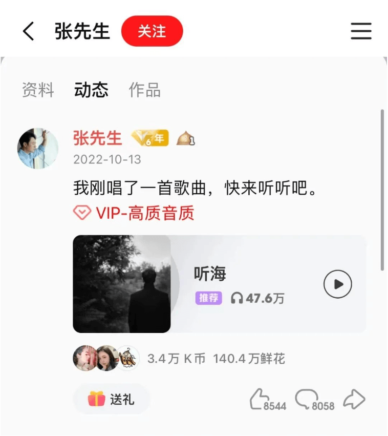 以张颂文“张先生”的全民K歌账号为例。短短几天,张颂文K歌账号排名前列的作品播放量暴涨,登顶热门第一的翻唱作品已有高达百万的“鲜花”礼物。