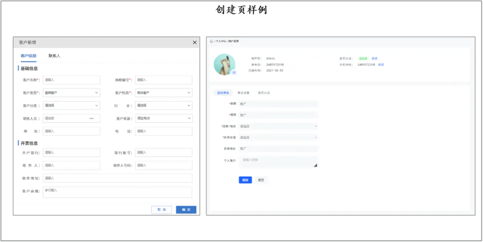 以CRM的客户为例,在初次接触获取客户资料时,一般能知道客户的名称、性别、年龄等信息,那么这些信息在客户创建时则需要由录入人员完成填写。而比如客户的风险投资信息、个人习惯等在初次接触时并不一定能获取,那创建时是否需要填写则视业务实际情况来决定了。