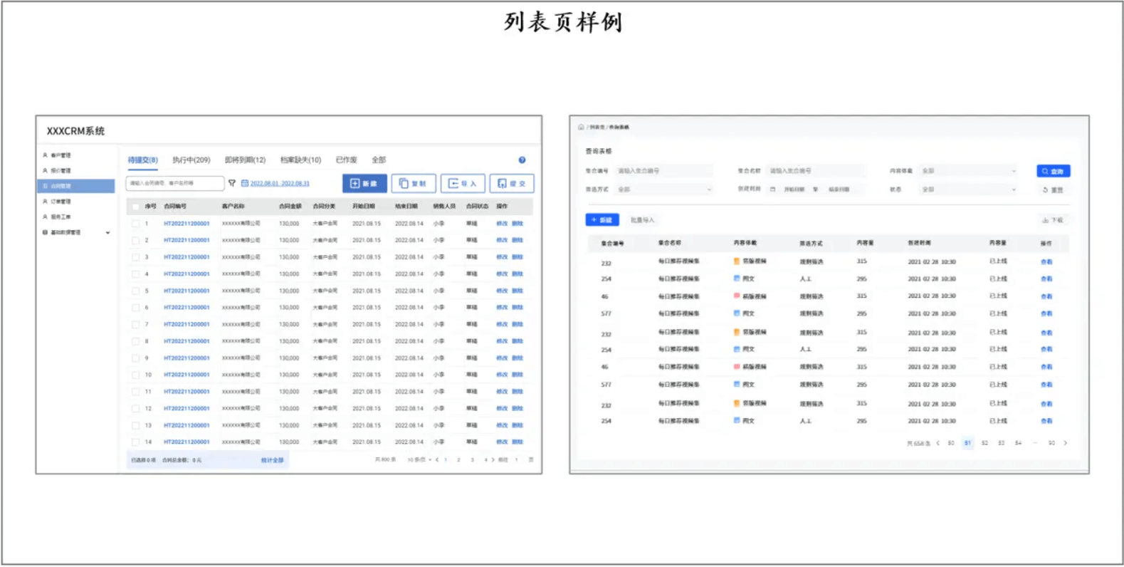 列表页一般包含:搜索项、数据列表、功能按钮、统计项等。搜索项指数据的查询搜索内容,便捷查询对象数据;数据列表指展示对象多条数据及数据字段信息的表格;功能按钮指对象的功能操作按钮,如:新建、提交等;统计项指多条数据的汇总统计,如客户列表上支持统计选择的客户的交易总金额等。