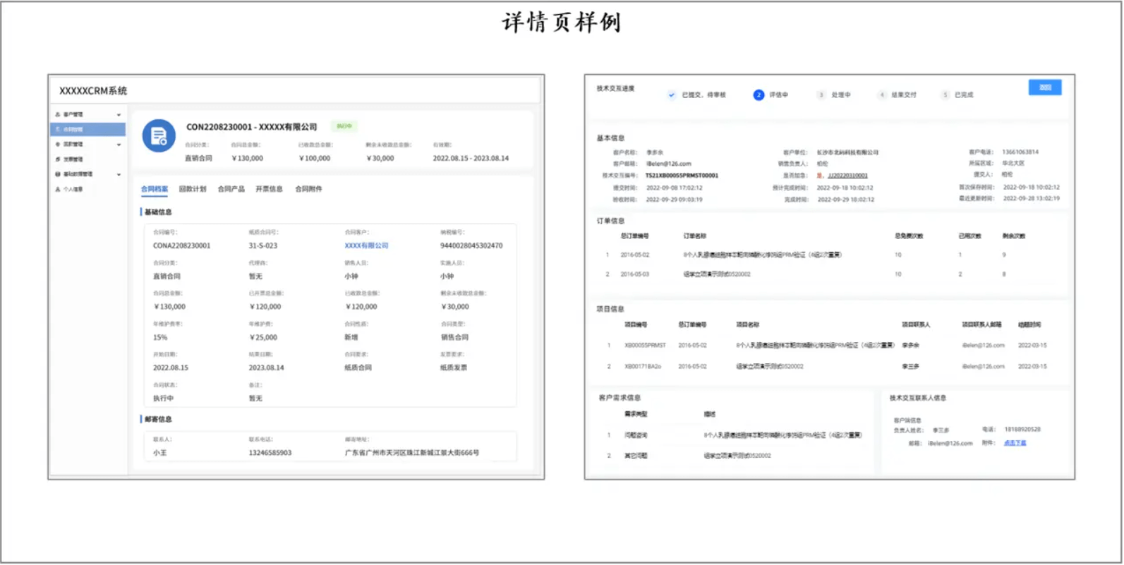详情页首页可适当增加一些数据分析统计报表,辅助展示数据详情信息,可更直观地、形象地展示数据档案,如:合同详情可增加合同订单交付情况、合同回款情况的统计分析,使用可视化图表进行呈现,能够让用户更方便地查看到当前合同的信息。