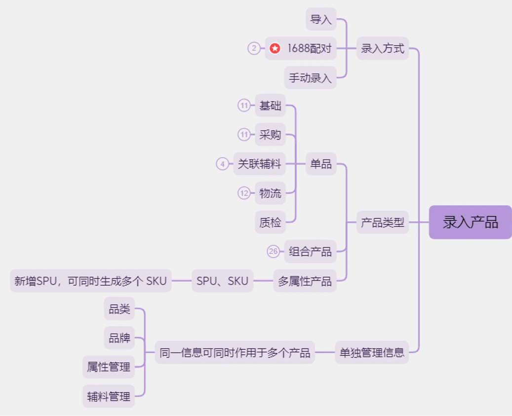 以上描述了单品、组合产品、多属性产品录入信息时的功能和内容,以下几类信息是需要在录入产品之前维护的信息,有品类、品牌、属性等。